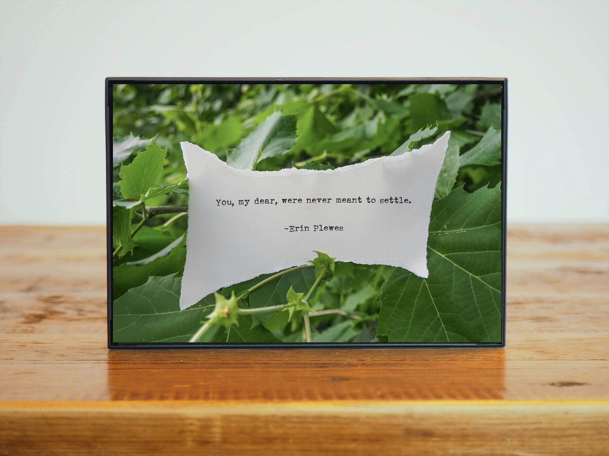 "Never Meant To Settle" is a print of an inspiring words placed in bright green leaves. These affirming words are meant to remind you of your strength. Each photograph comes in 2 sizes and can be purchased framed or matted. By giving this meaningful gift to a loved one (or to yourself) it is meant to bring you peace.