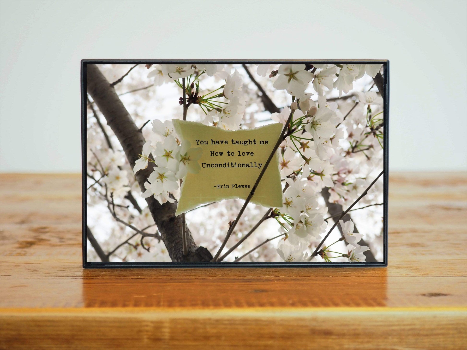 "Unconditional Love" is a print of an inspirational poem that I wrote placed in nature. Nestled in cherry blossoms this piece is a meaningful gift perfect for Mother's Day! Each photograph comes in 2 sizes and can be purchased framed or matted. By giving this meaningful gift to a loved one (or to yourself) it is meant to bring you peace.