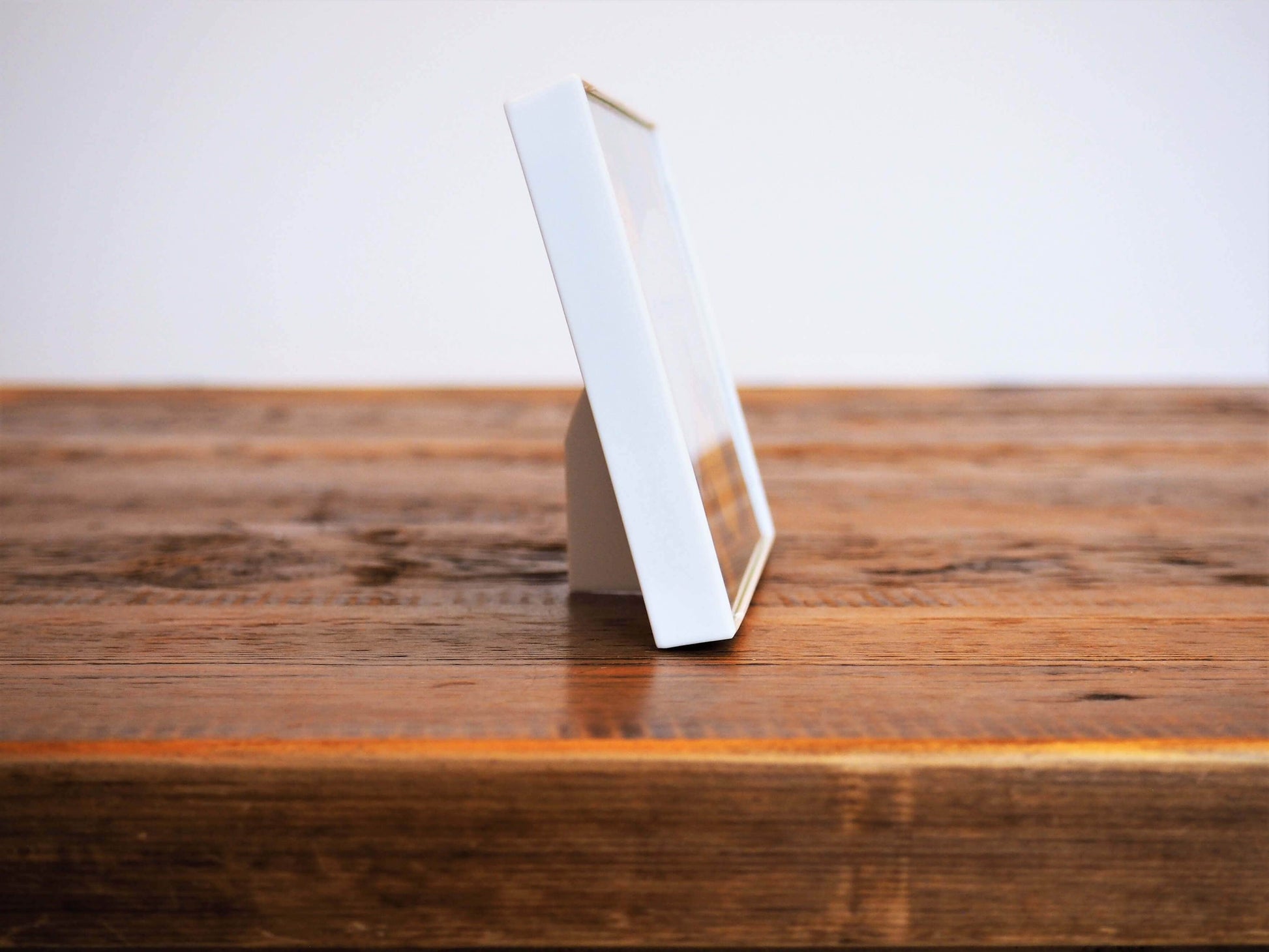 - The framed options come in either black or white. The frame’s compact nature fits tightly around the photo creating a thin black or white border. It has a glass front with a narrow depth and conveniently has the dual option of either standing or hanging.